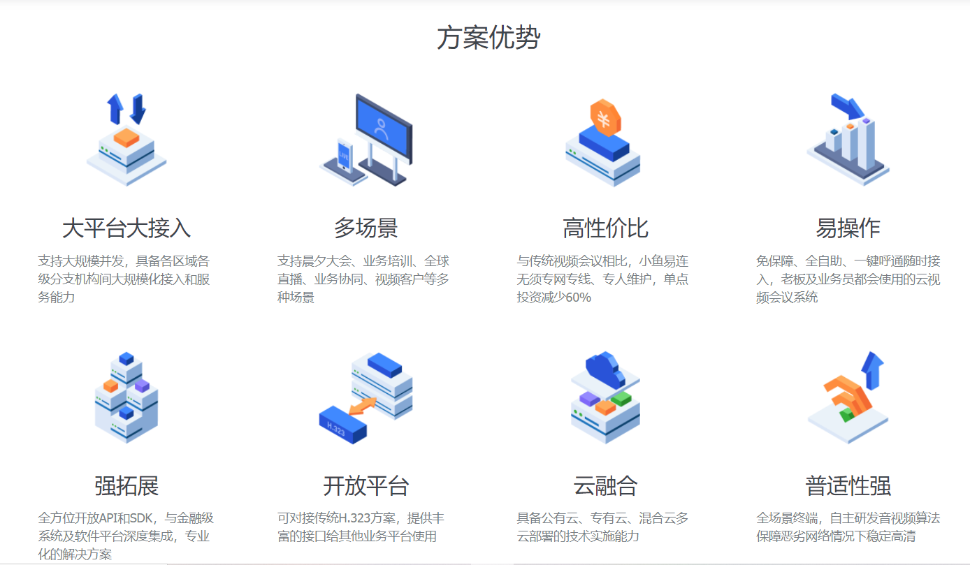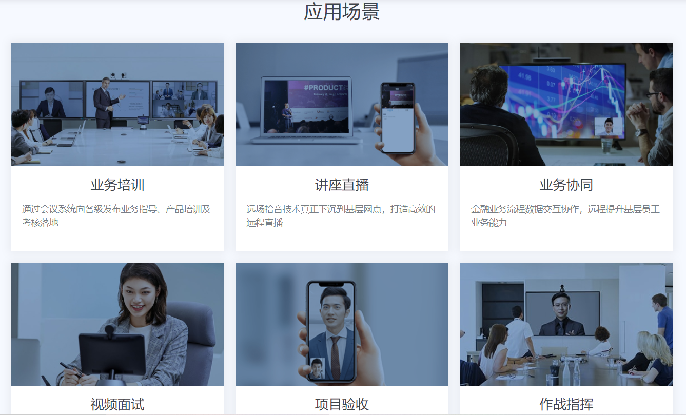 围绕 “大后台,小前台;大外网,小内网” 的信息化整体布局,打造面向移动互联的云视频服务系统,满足金融行业内外部便捷高清的远程会议需求,提供各类视频应用服务的能力